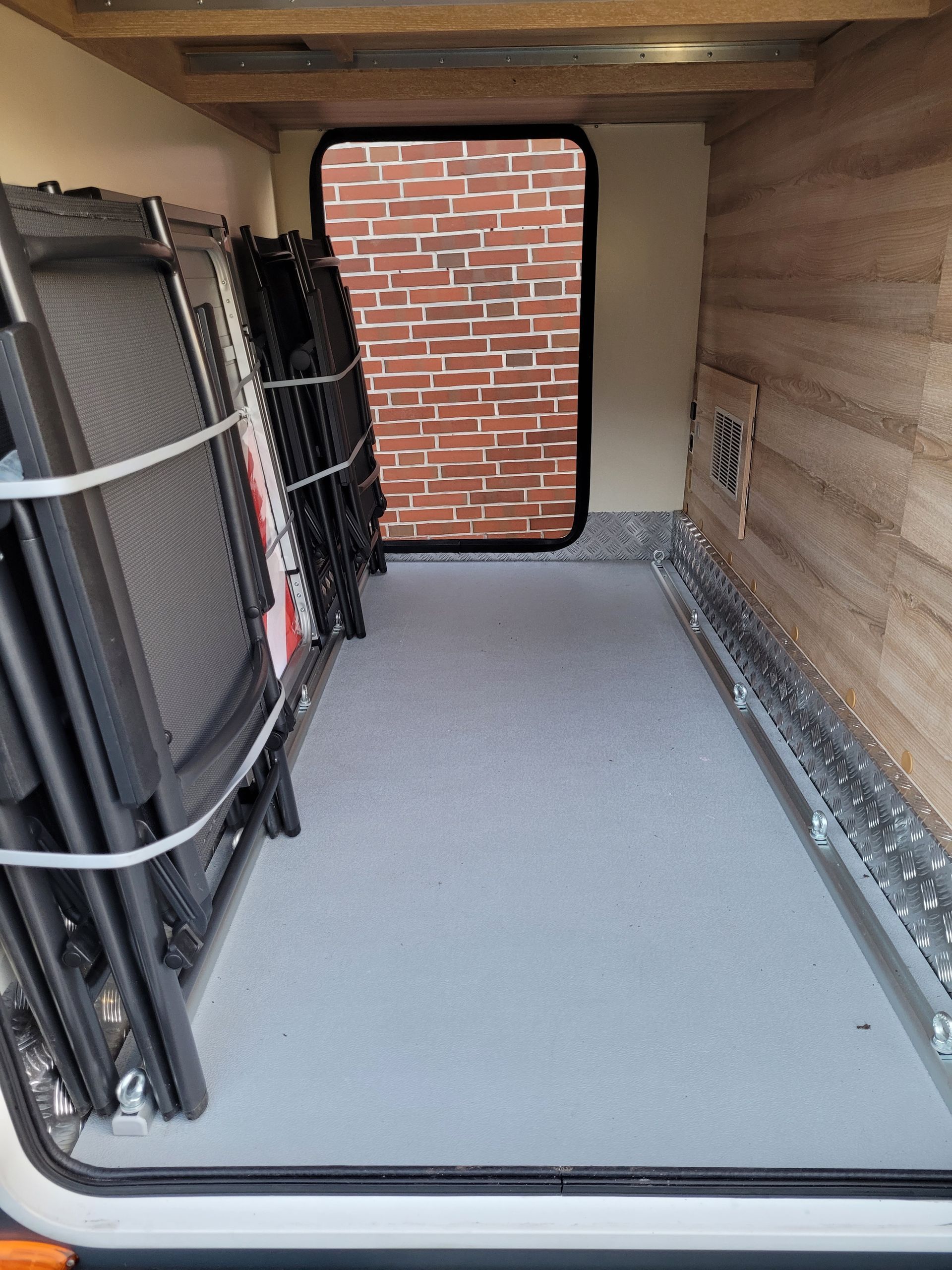 Zusätzliche Gegenstände, die Sie auf Reisen mitnehmen möchten, können mit Gurten oder Spanngurten an den vorhandenen Sicherungshaken, die im Boden verankert sind befestigt werden.