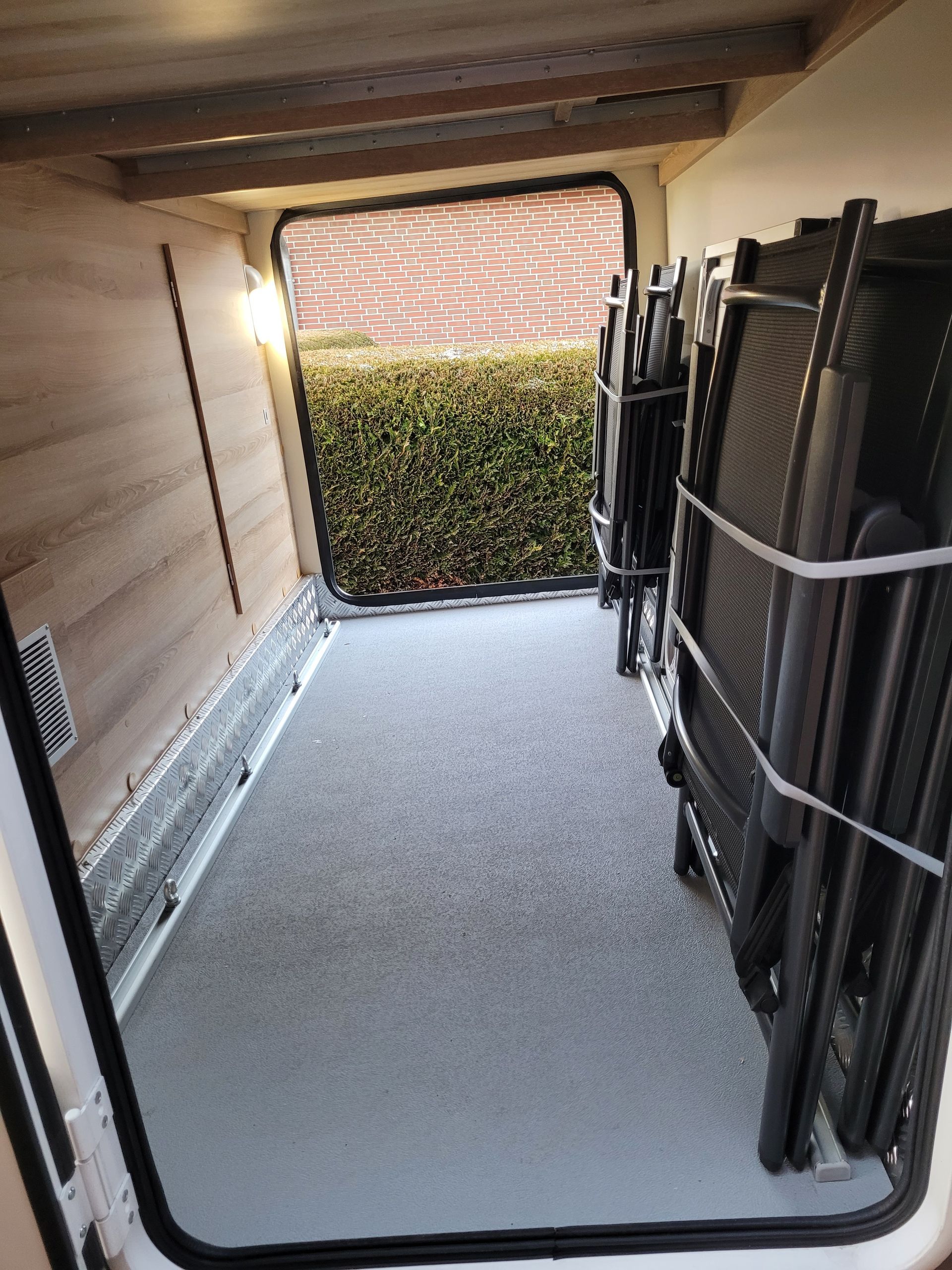 Die Campingmöbel sind sicher an den Seitenwänden der Garage befestigt.